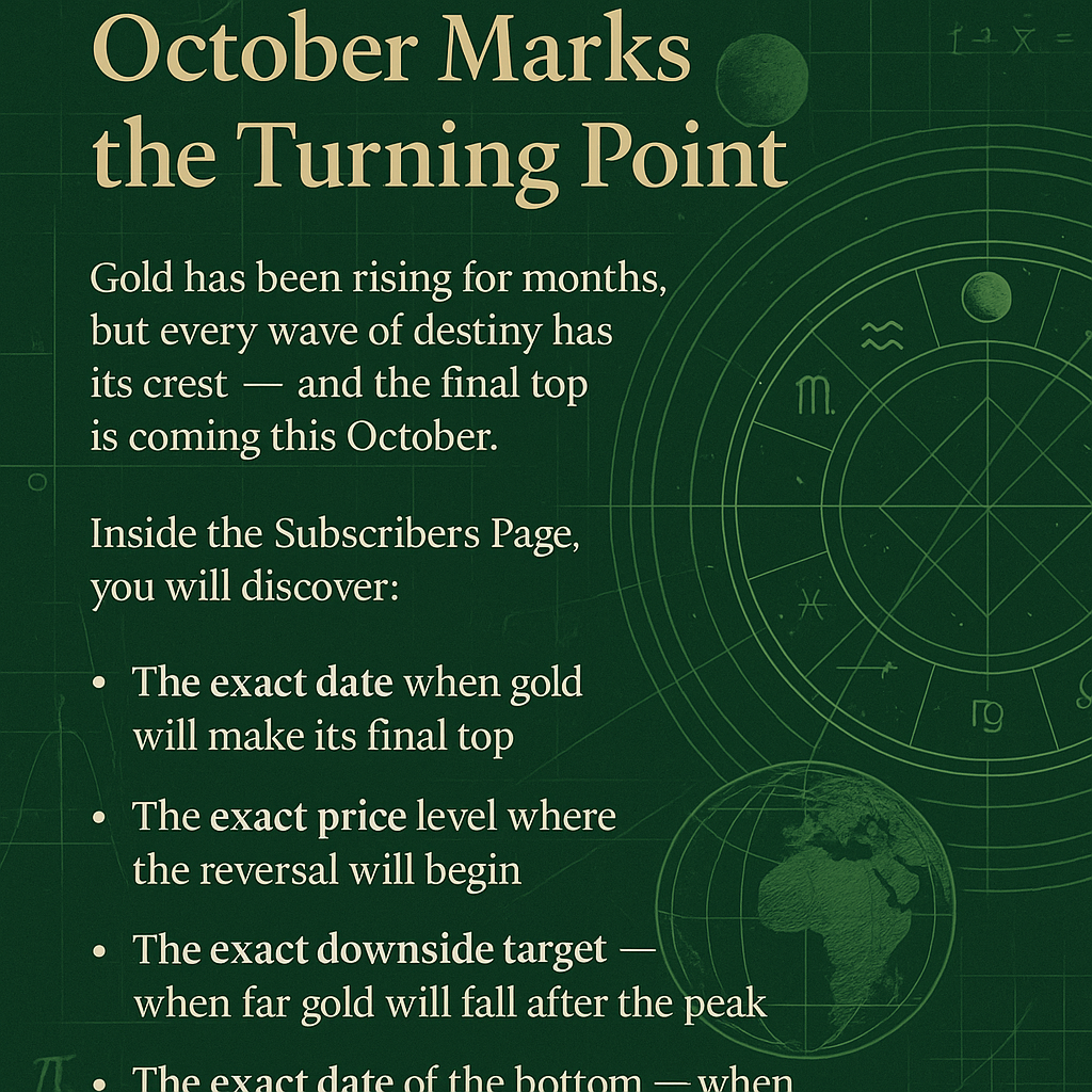 Gold’s Turning Point Is Near Gold has been rising steadily for months.But every trend, no matter how strong, reaches its moment of balance.According to our research, that moment arrives this October —when gold completes its mid-term ascent and prepares for a major shift. The Science Behind the Forecast For years, we’ve studied howtime, geometry, planetary